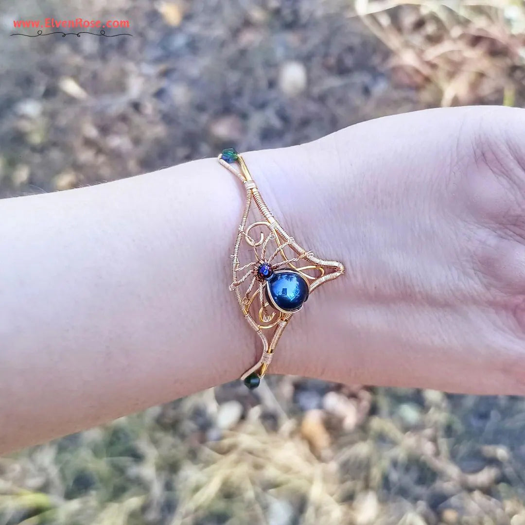 Unveil your mysterious side with the Golden Web Cuff Bracelet, a blend of elegance and enchantment. Handcrafted from non-tarnish gold plated wire, this unique cuff bracelet is adorned with a captivating spider design, featuring a body and head crafted from deep black and dark blue Czech glass. The delicate legs, shimmering in gold, add a touch of glamour to this bold piece.