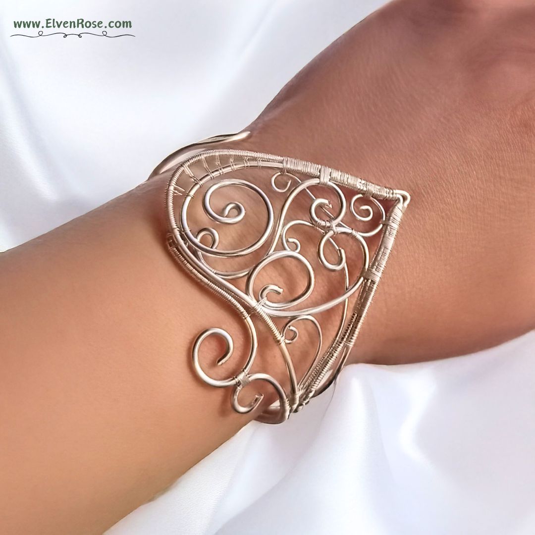 This elegant bracelet features a stylized heart adorned with swirling spirals and vine-like patterns, echoing the timeless beauty of nature and the mystique of elven lore. Carefully handcrafted from non-tarnish silver-plated wire, it offers both durability and a luminous, ethereal shine.