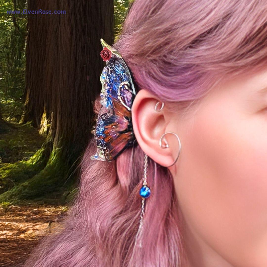 These handcrafted fairy ears are born from dreams and dusk. Made with shimmering resin in vibrant shades of sapphire blue, violet, black, and hints of iridescence, each wing-like ear is crowned with a miniature red rose – a symbol of the secret garden that blooms only at moonrise.